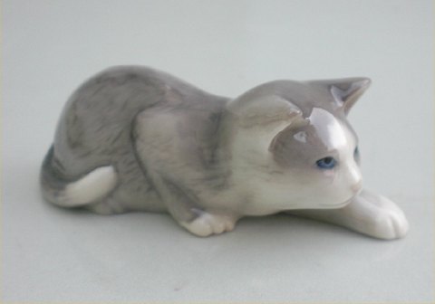 Beskrivelse: Kgl. figur fra Royal Copenhagen 686 Kgl. Minikatten "Leo" 3 x 8,5 cm AT Mini Cat collection I hel og fin stand